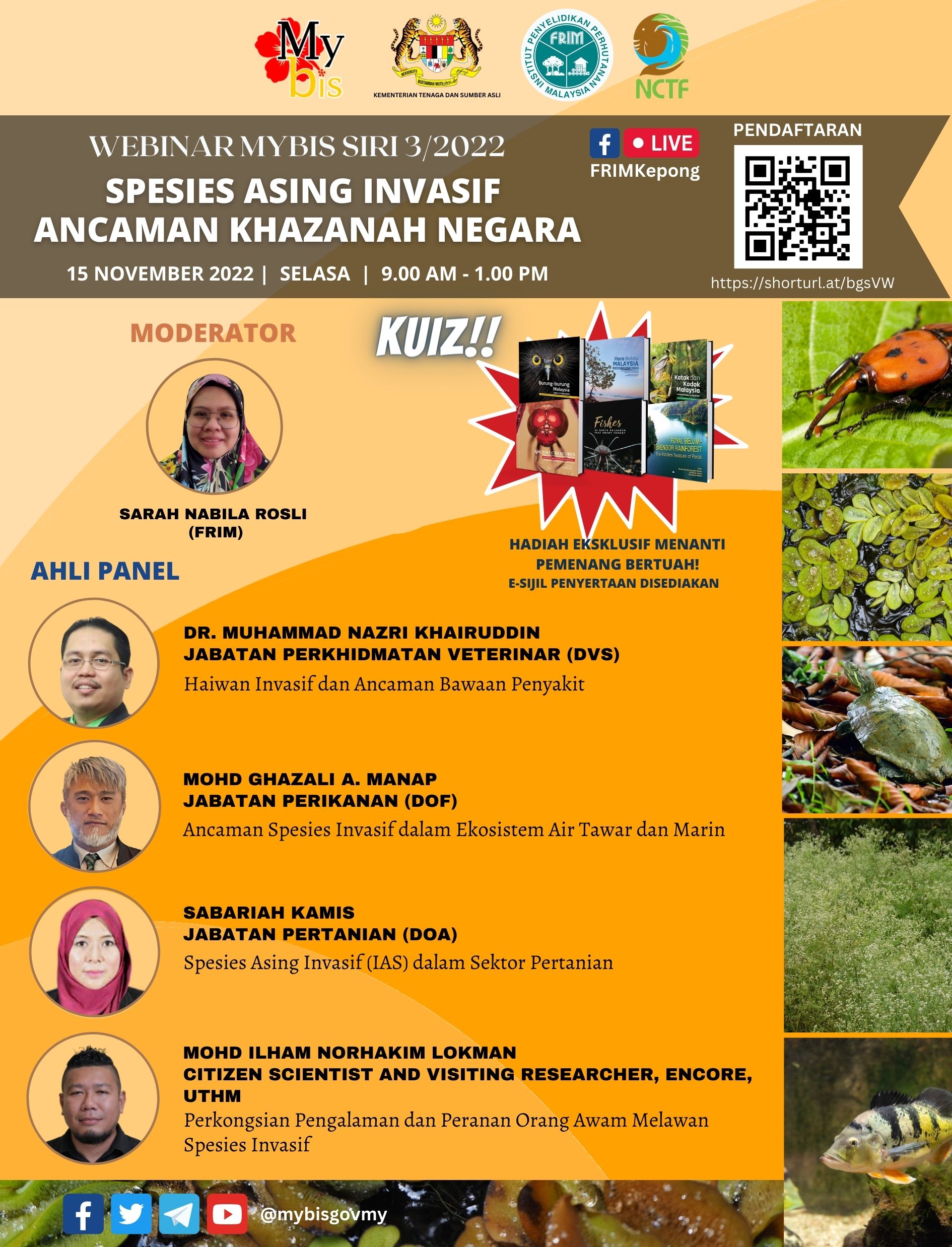 Webinar mengenai spesies invasif yang wujud di Malaysia serta penerangan mendalam mengenai ancaman dan langkah-langkah pencegahan secara dalam talian melalui pautan pendaftaran ZOOM seperti berikut:-