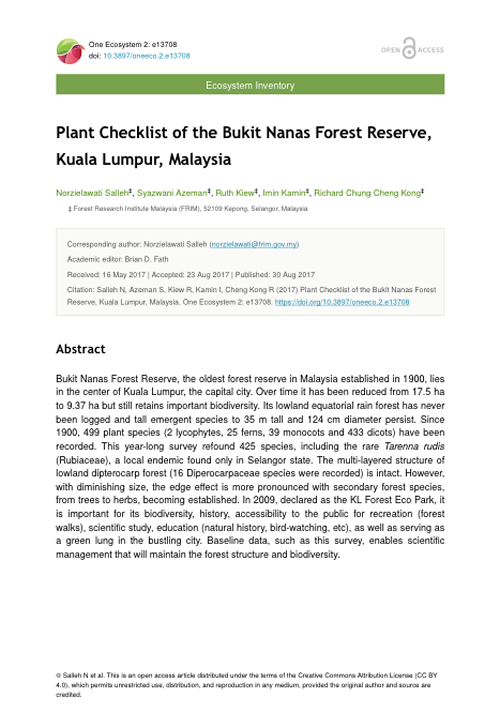 Bukit Nanas Forest Reserve, the oldest forest reserve in Malaysia established in 1900, lies in the center of Kuala Lumpur, the capital city. Over time it has been reduced from 17.5 ha to 9.37 ha but still retains important biodiversity. Its lowland equatorial rain forest has never been logged and tall emergent species to 35 m tall and 124 cm diameter persist. Since 1900, 499 plant species (2 lycophytes, 25 ferns, 39 monocots and 433 dicots) have been recorded. This year-long survey refound 425 species, including the rare Tarenna rudis (Rubiaceae), a local endemic found only in Selangor state. The multi-layered structure of lowland dipterocarp forest (16 Diperocarpaceae species were recorded) is intact. However, with diminishing size, the edge effect is more pronounced with secondary forest species, from trees to herbs, becoming established. In 2009, declared as the KL Forest Eco Park, it is important for its biodiversity, history, accessibility to the public for recreation (forest walks), scientific study, education (natural history, bird-watching, etc), as well as serving as a green lung in the bustling city. Baseline data, such as this survey, enables scientific management that will maintain the forest structure and biodiversity.